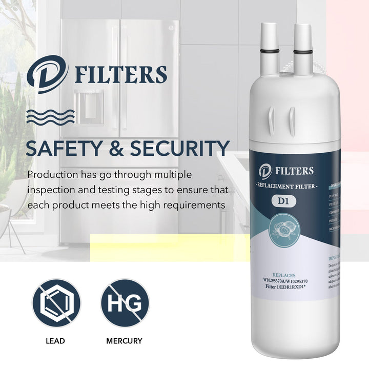 This(D1) refrigerator water filter 1 could reduce 24 impurities in water as well as other harmful contaminants. The fridge filter is compatible with Everydrop Water Filter 1, W10295370A, EDR1RXD1 Water Filter and 9081 Water Filter. We recommend to replace the filter every 6 months to ensure the filtration performance.