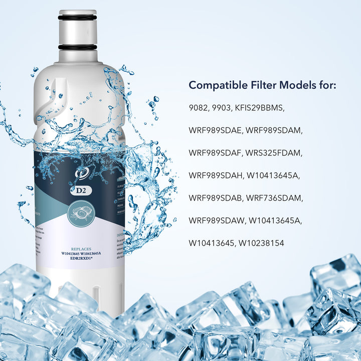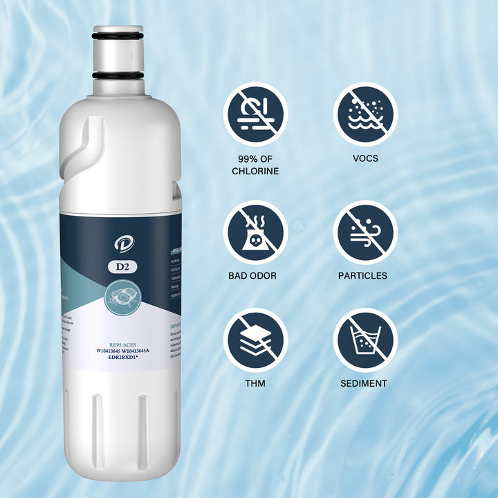 This(D2) refrigerator water filter 1 could reduce 24 impurities in water as well as other harmful contaminants. The fridge filter is compatible with Everydrop Water Filter 2, W10413645A EDR2RXD1 Water Filter and 9082 Water Filter. We recommend to replace the filter every 6 months to ensure the filtration performance.