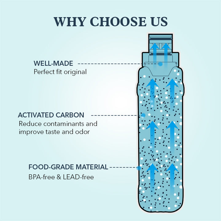 BPA-Free and food-grade materials, Sri Lankan coconut shell carbon block, super adsorption capacity, maximum reduction of harmful impurities contained in drinking water,