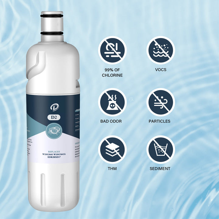 This(D1) refrigerator water filter 1 could reduce 24 impurities in water as well as other harmful contaminants. The fridge filter is compatible with Everydrop Water Filter 1, W10295370A, EDR1RXD1 Water Filter and 9081 Water Filter. We recommend to replace the filter every 6 months to ensure the filtration performance.